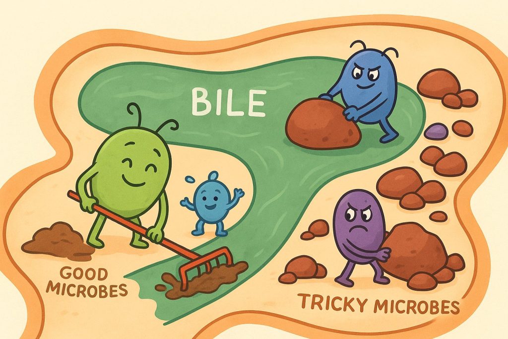 Picture your microbiome as a busy bush-camp of riverkeepers. Some microbes dredge the stream and keep bile flowing, while others sneak in when the camp weakens, stirring up sediment and raising cholesterol → stones begin to form.